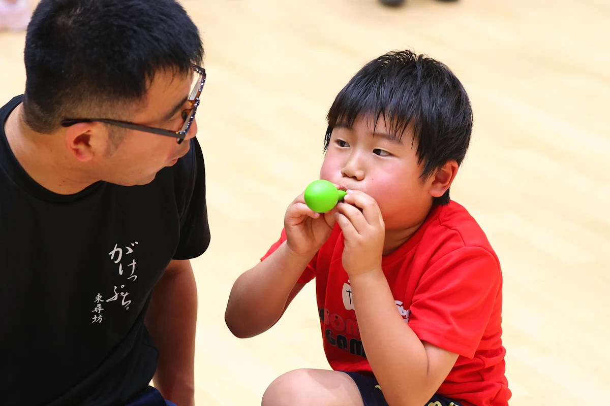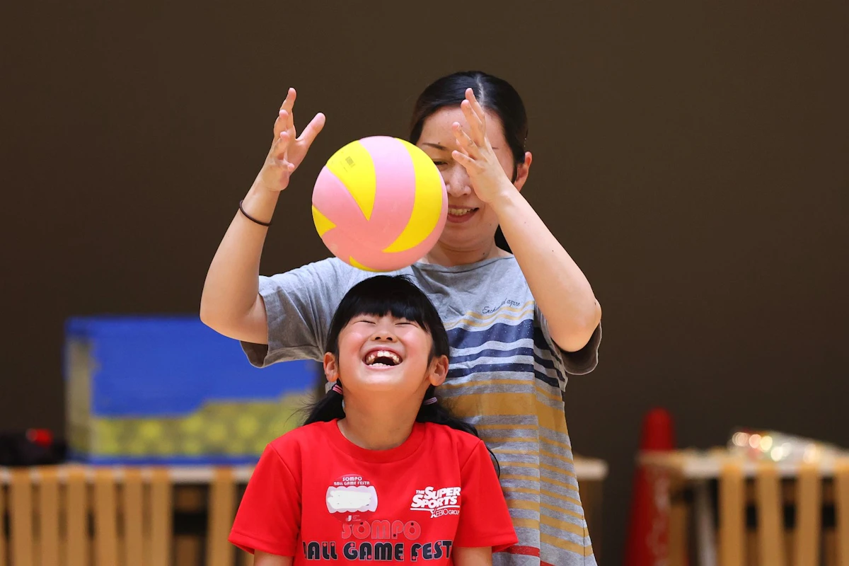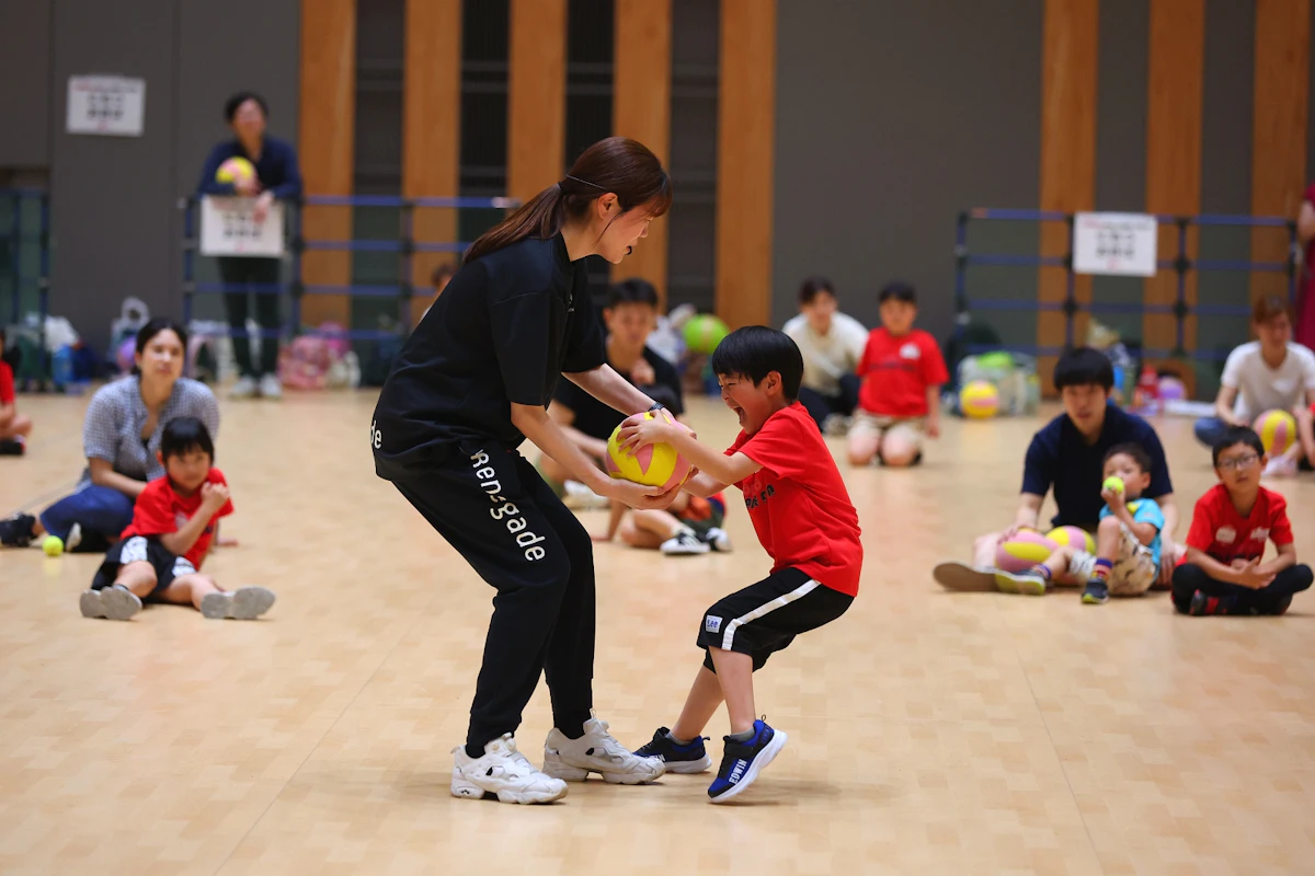 スペシャルゲストとして元新体操日本代表の坪井保菜美さんが参加され、遊びを通して運動の基礎を作るプログラムと3競技を体験しました。