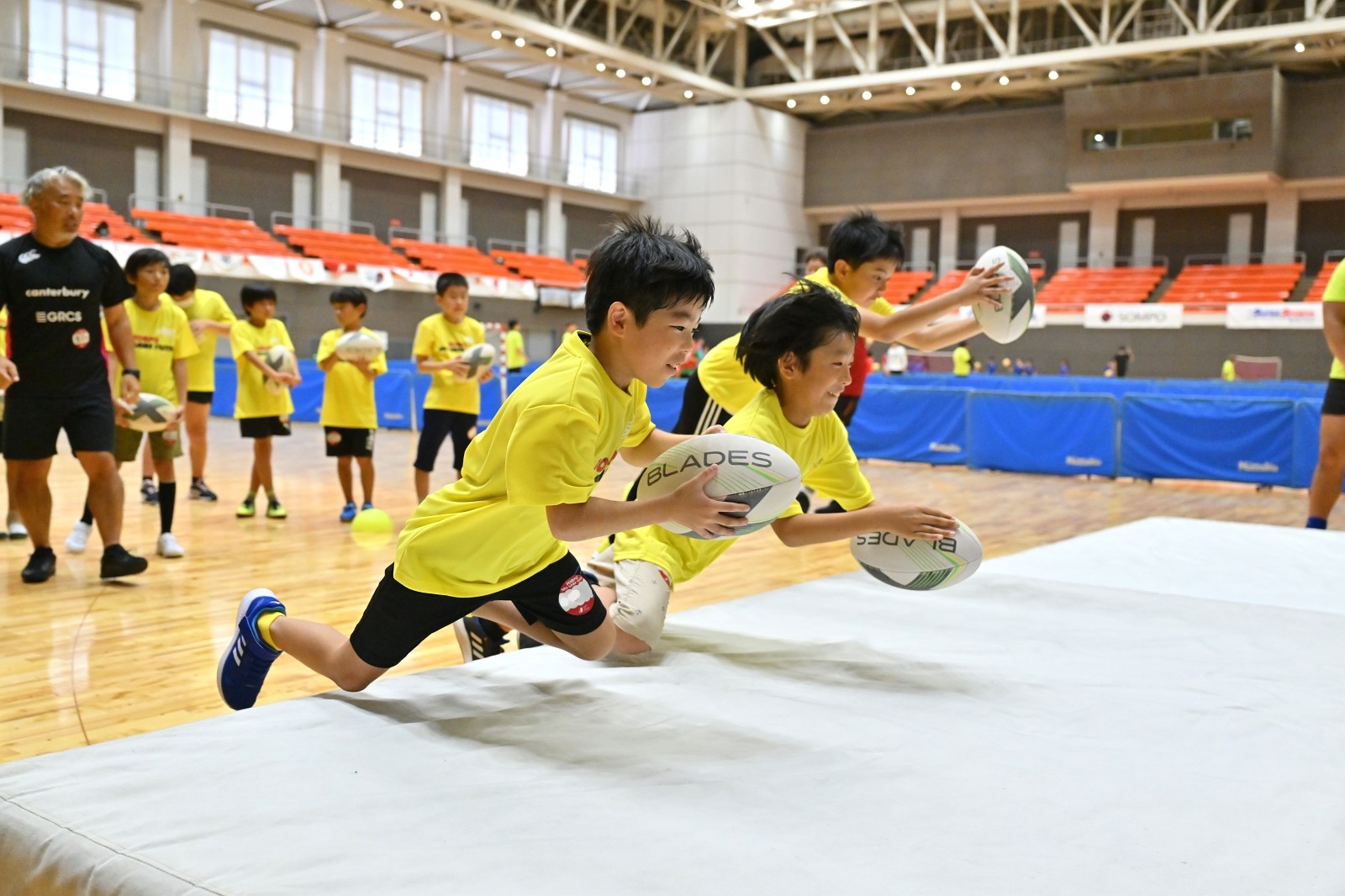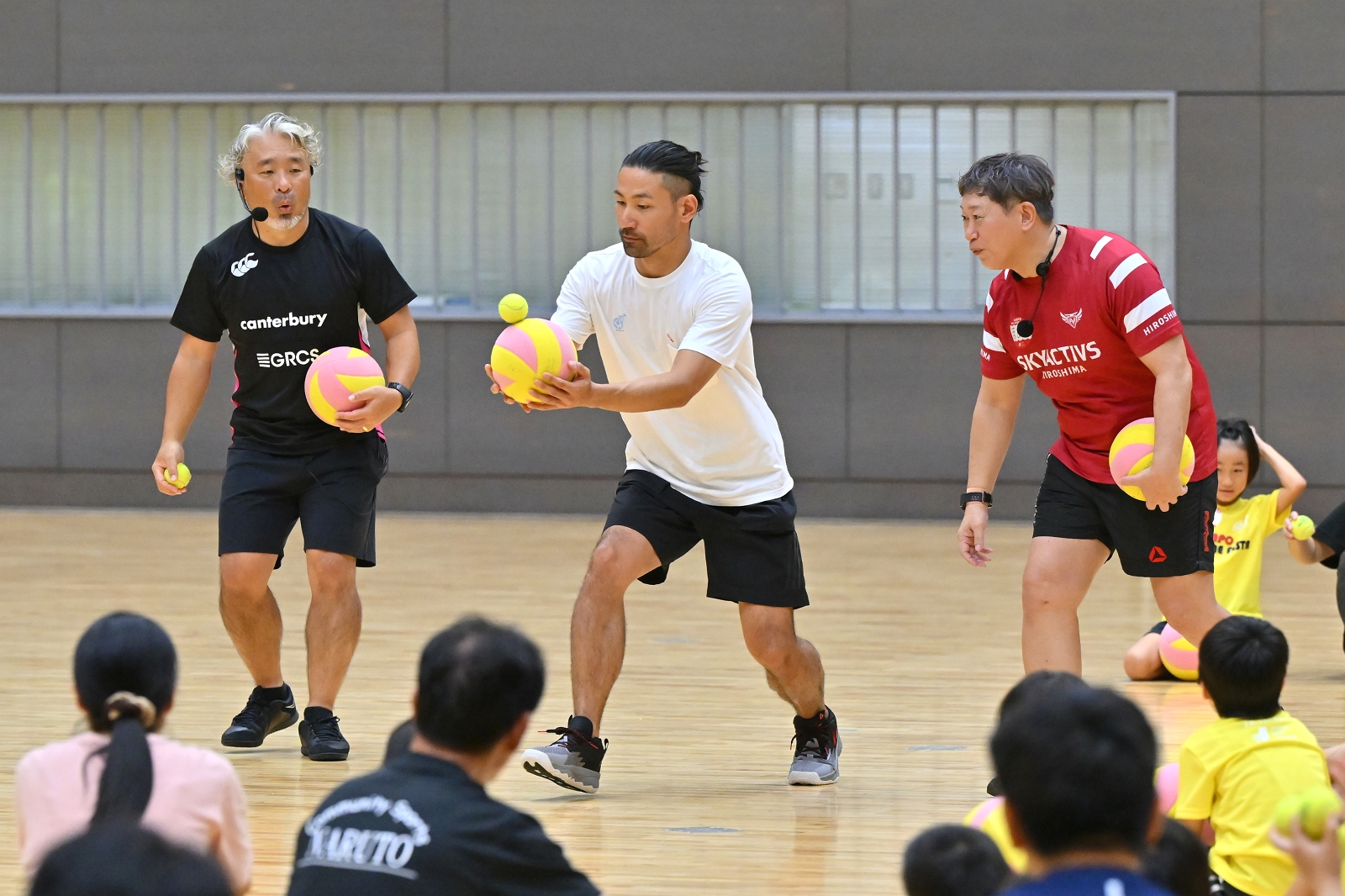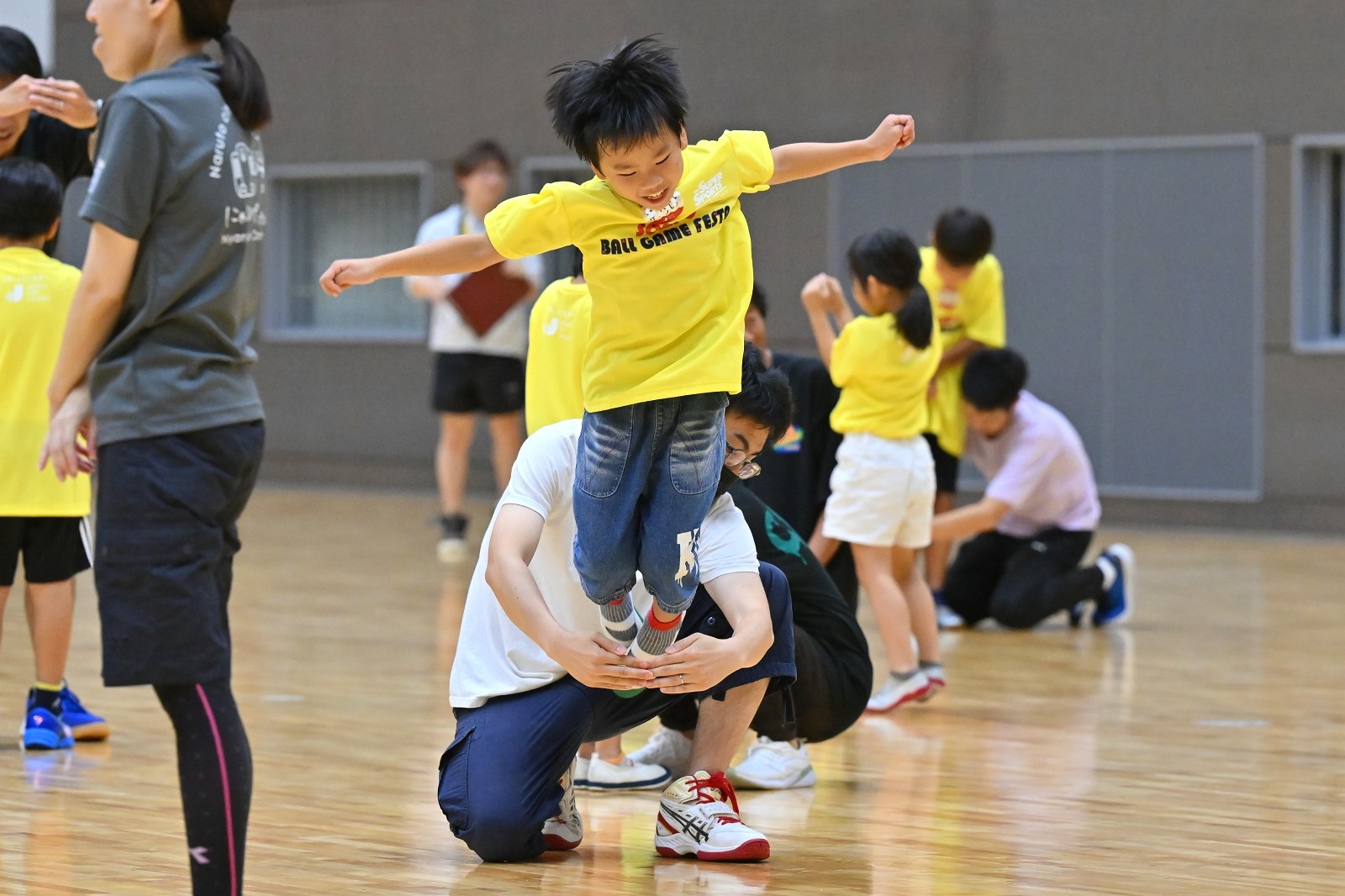 徳島県では今回で5度目の開催となり、午前のあそビバ!には80組近くの親子が参加し、丸いボールだけでなく、普段触れる機会の少ないラグビーボールを使った「運動あそび」を楽しんでいる姿が印象的でした。