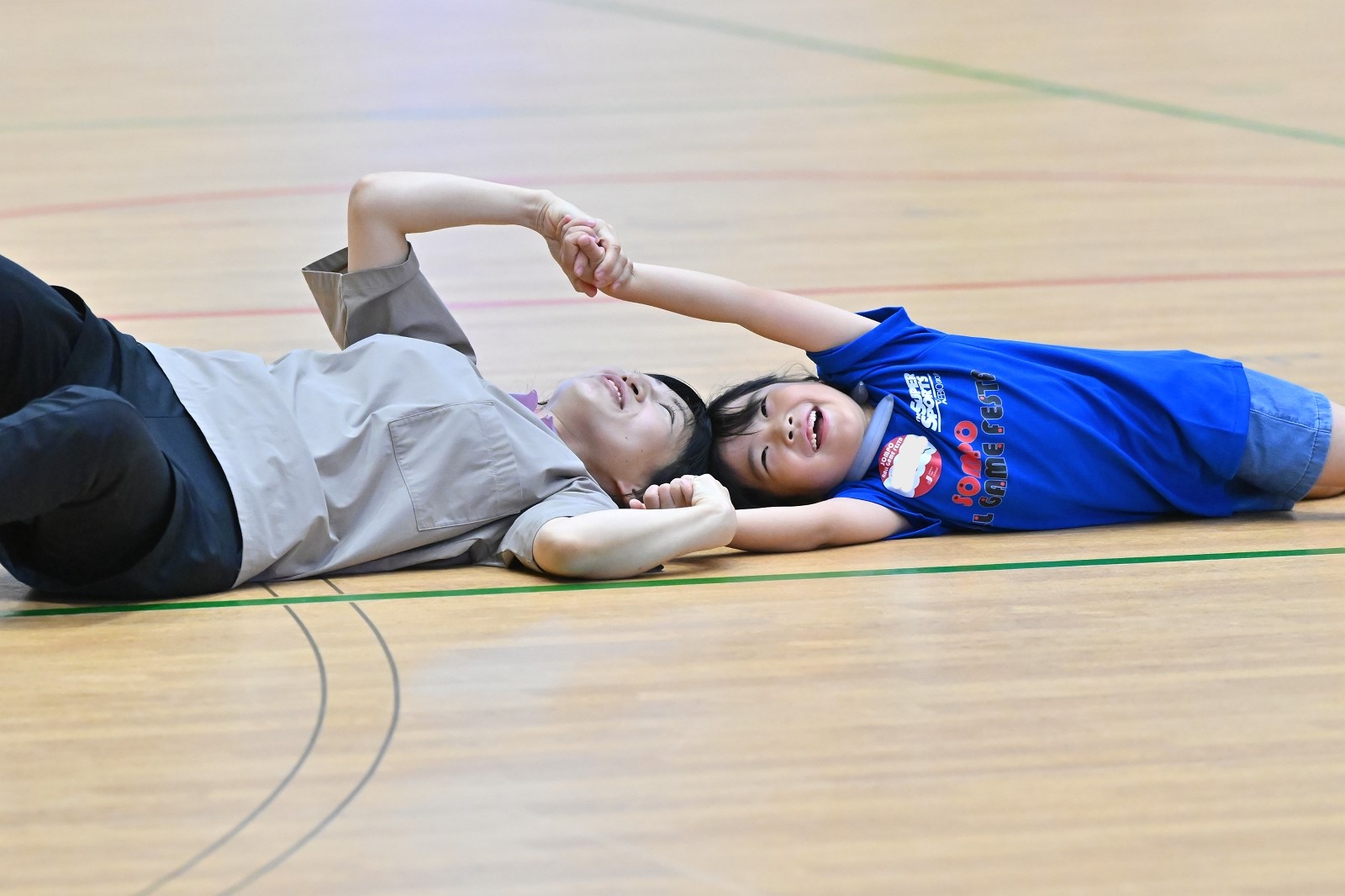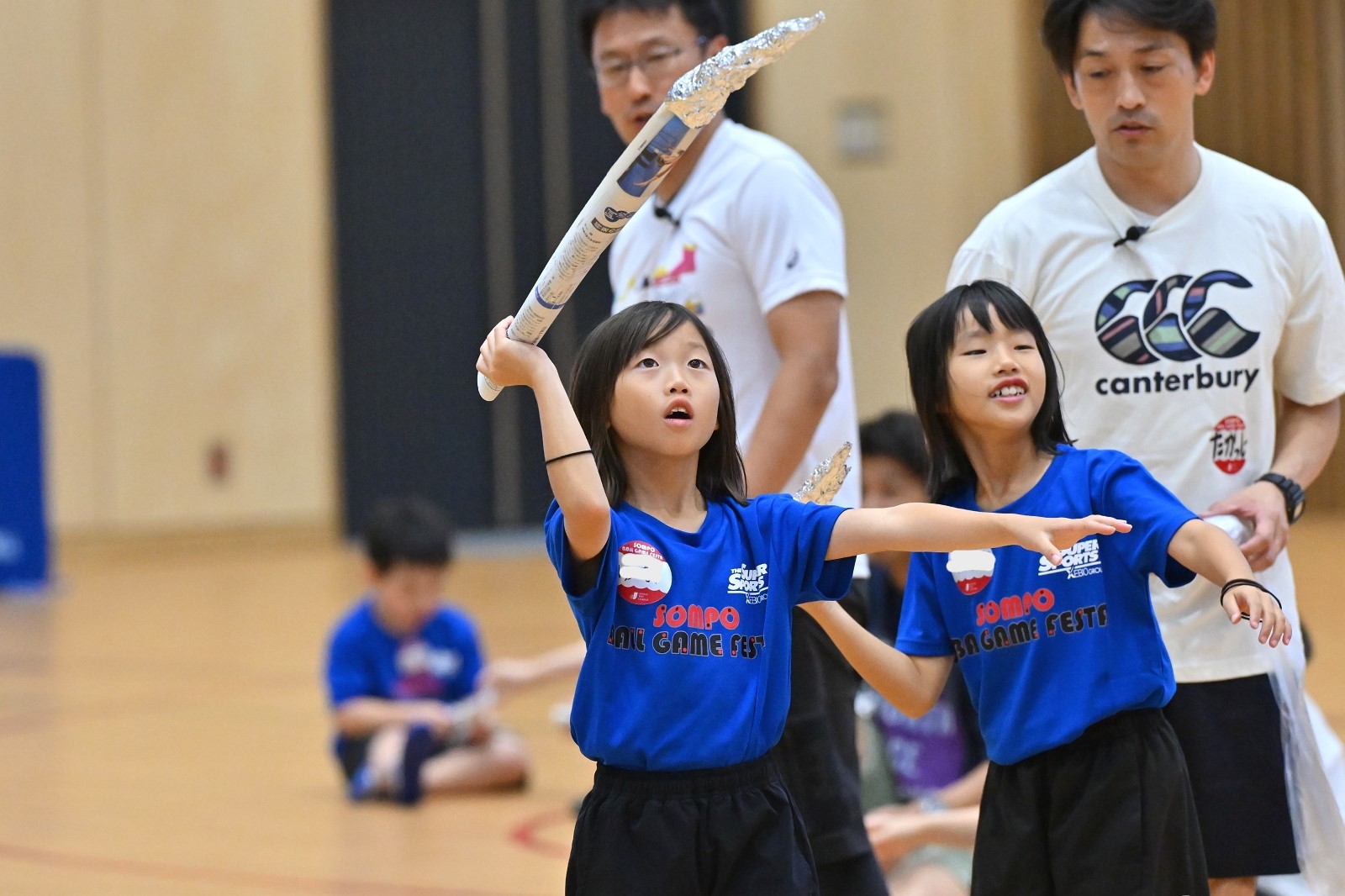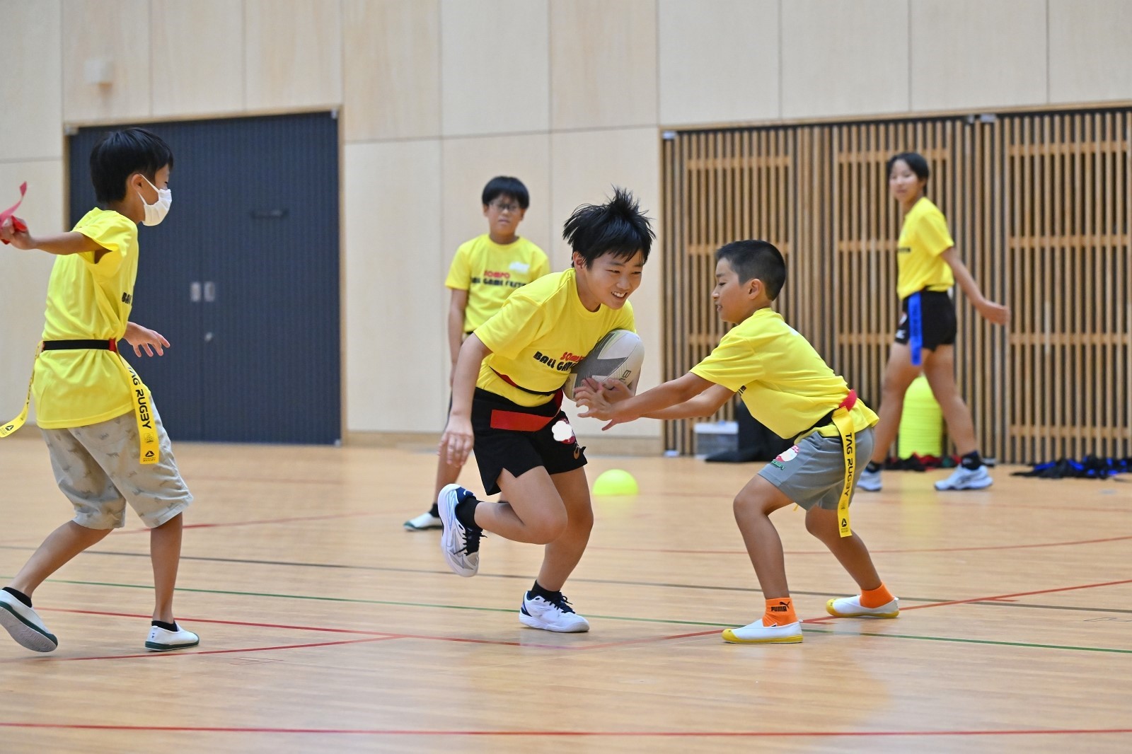 午後のラグビーではマットに向かってトライの体験をしたり、相手のタグを取った際のコールである「タグ!」という声が会場内にたくさん響き渡っていました!