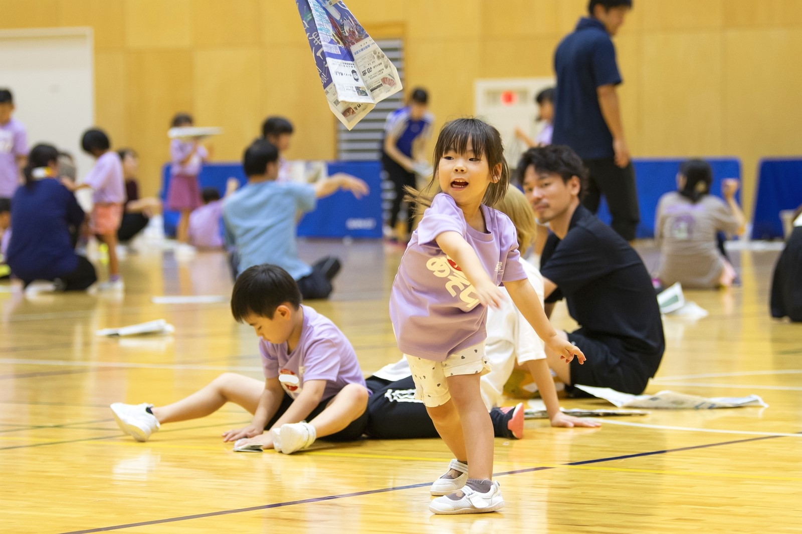 当日は運動遊びやボール遊びのほか、子どもたちは新聞紙を使って「紙鉄砲」や「紙飛行機」作りにチャレンジしました。