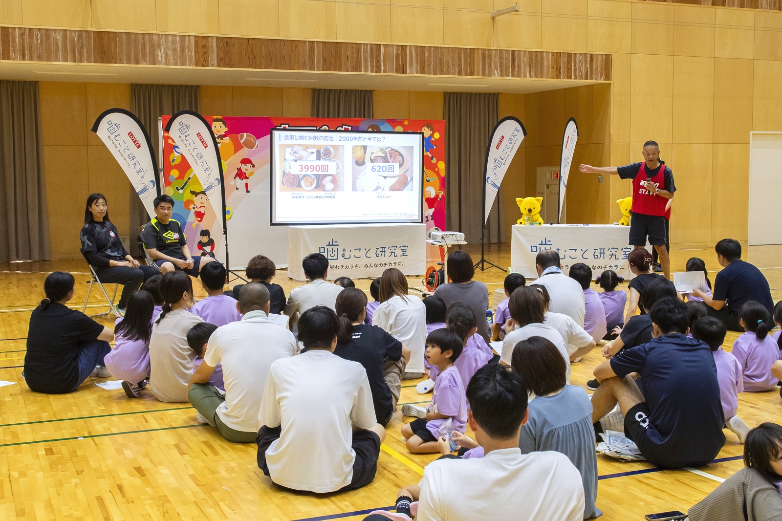 各回終了後には「噛むこと教室」を実施し、フーセンガムを膨らませるチャレンジを行い、参加の子どもたちからは「できない~!」と苦戦しながらも楽しく親子で学んでいる姿が見られました。