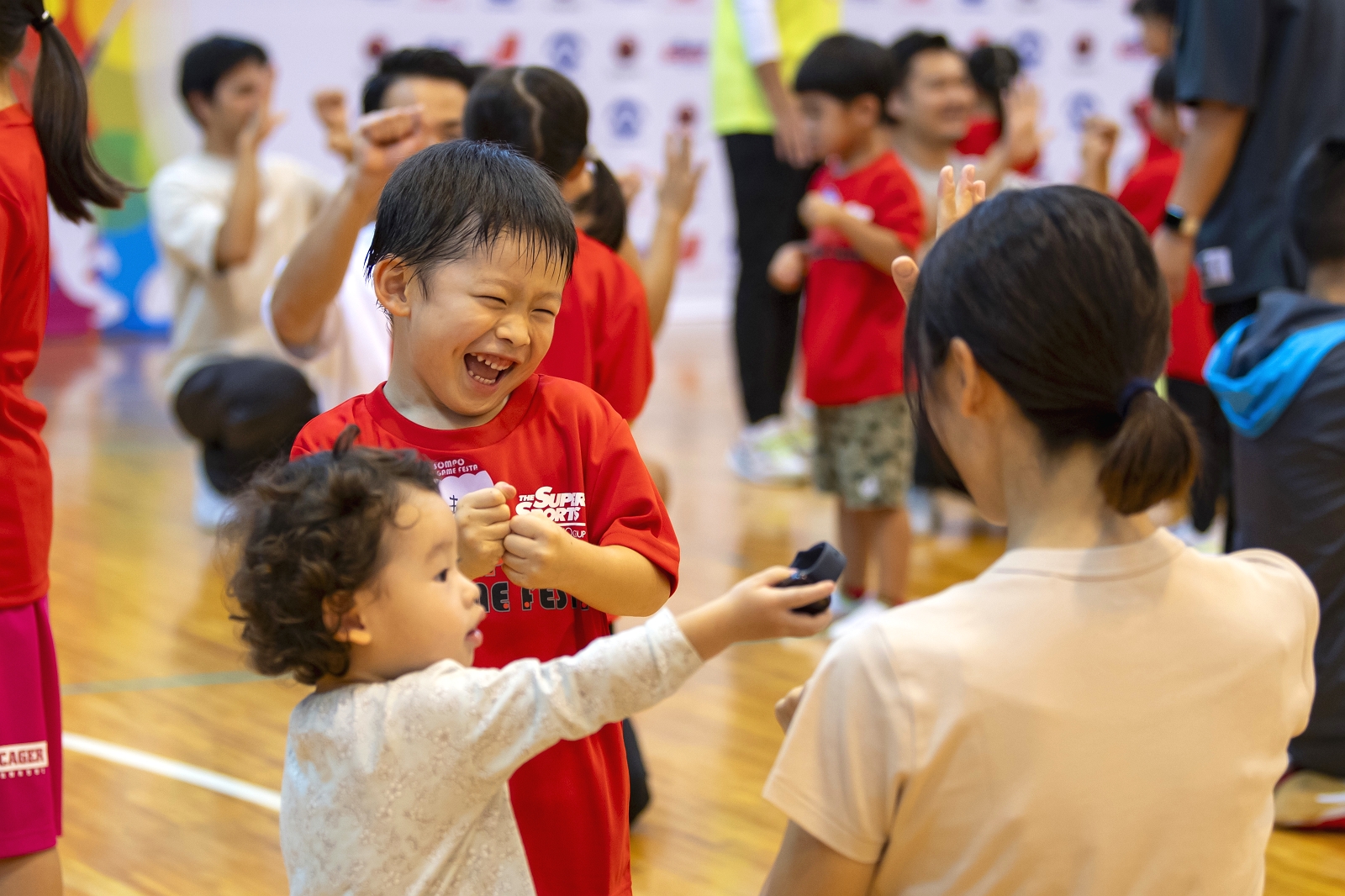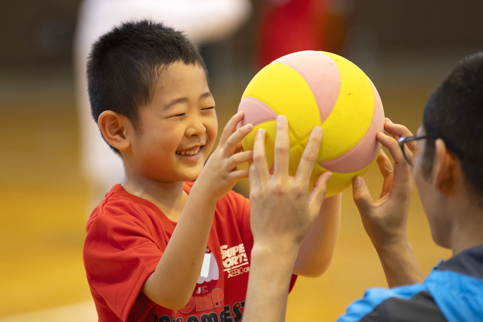 5回目の開催となった今年度の富士吉田開催当日はあいにくのお天気となりましたが、会場内にはプログラム開始前から元気いっぱい遊ぶ子どもたちで溢れていました。そしてキッズチャレンジの開講式では、講師から種目の紹介やデモンストレーションが披露されました。子どもたちは目を輝かせて見つめる中、ハンドボールのシュートが決まった瞬間は子どもたちだけでなく、会場全体にその日一番の歓声が巻き起こっていました。