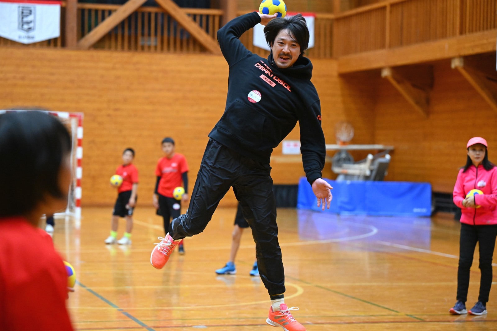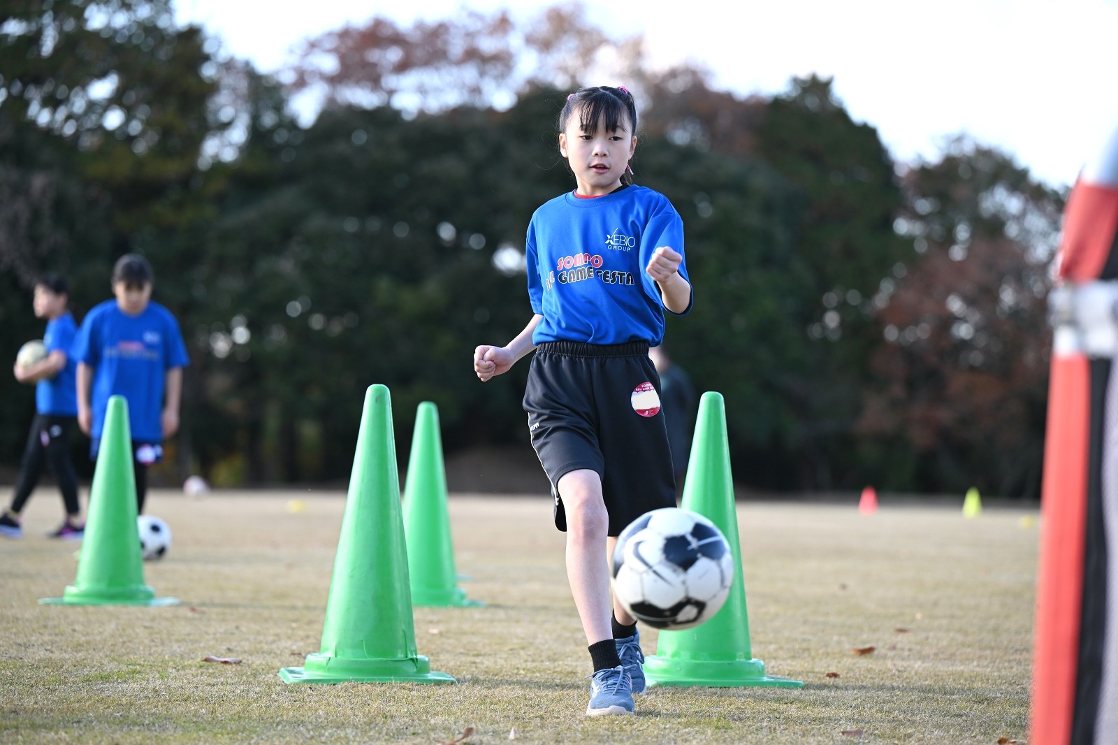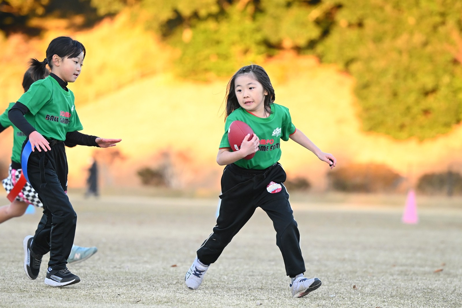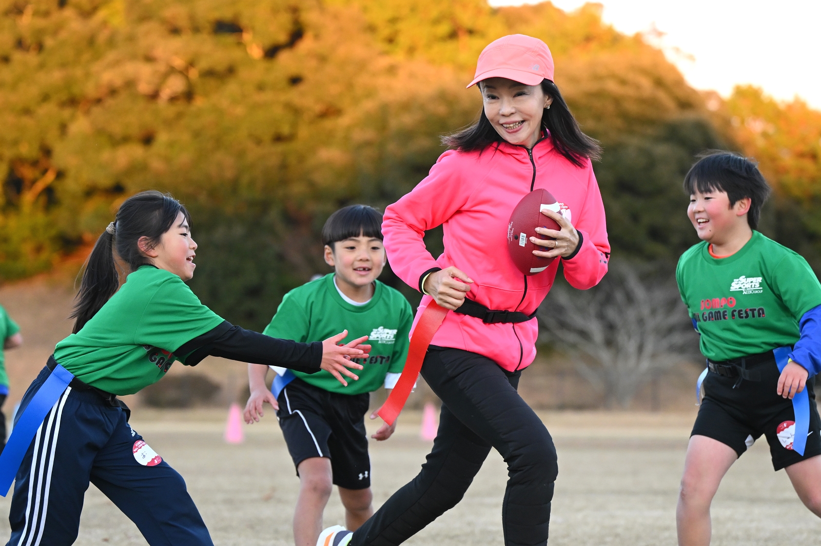 今回、元マラソン日本代表の千葉真子さんに初めてゲストとしてご参加いただき、午後のキッズチャレンジでは体育館でバスケットボールとハンドボール、隣のグラウンドではサッカーとアメリカンフットボールの計4種目を子どもたちと一緒に体験していただきました。グラウンドは太陽が隠れると真冬の寒さを感じられる冷たい風が吹いていましたが、子どもたちは4種目目が終わるまで、もらった半袖のTシャツ姿で元気に各種目に打ち込んでいました。