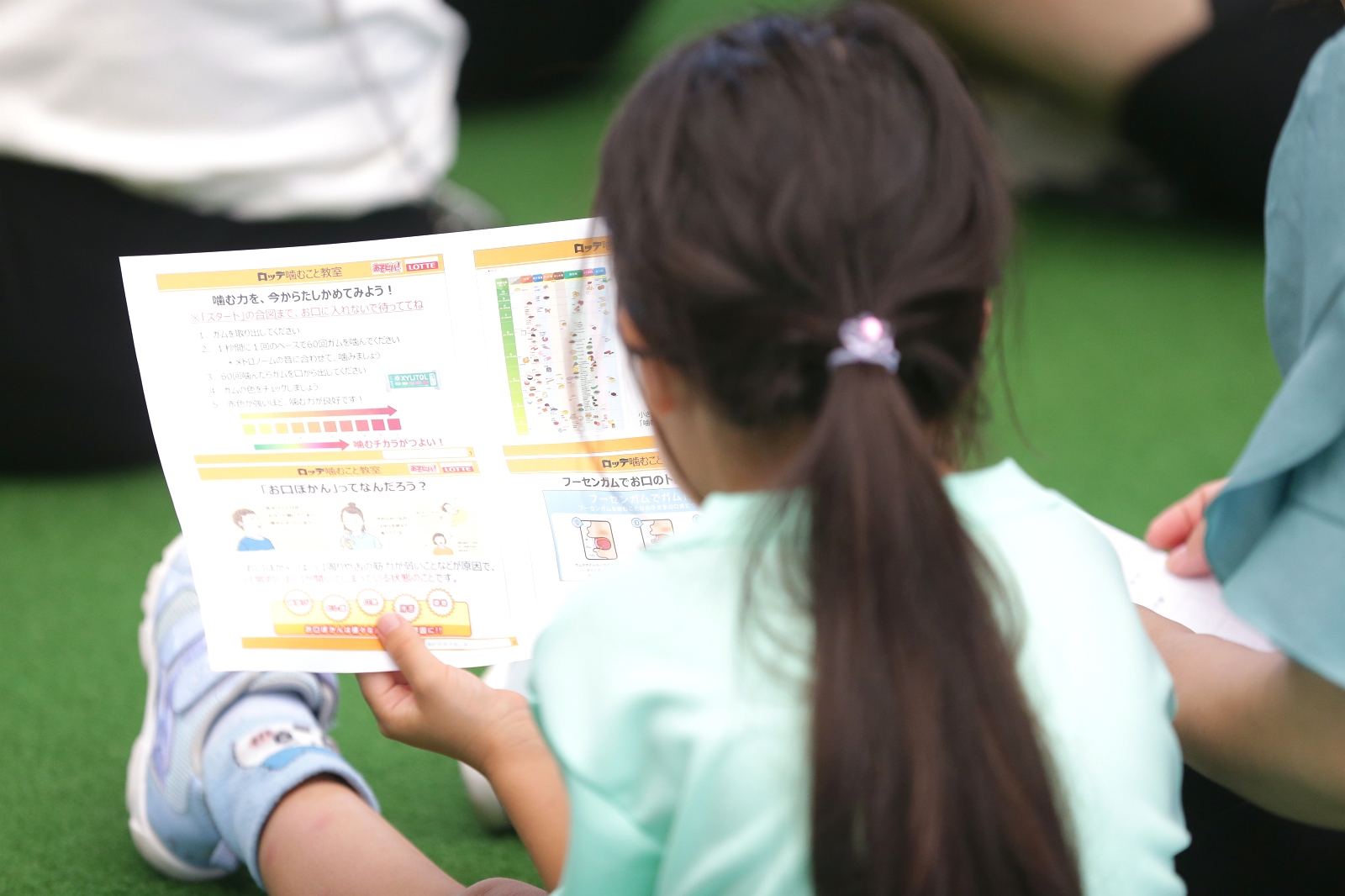 運動プログラムのあとには、今年も株式会社ロッテ様のご協力のもと「噛むこと教室」を実施しました。このプログラムを通して、お父さんお母さんだけでなく子どもたちにも日頃から食事の中で「噛む」ことを意識してもらえることを心より願っております。