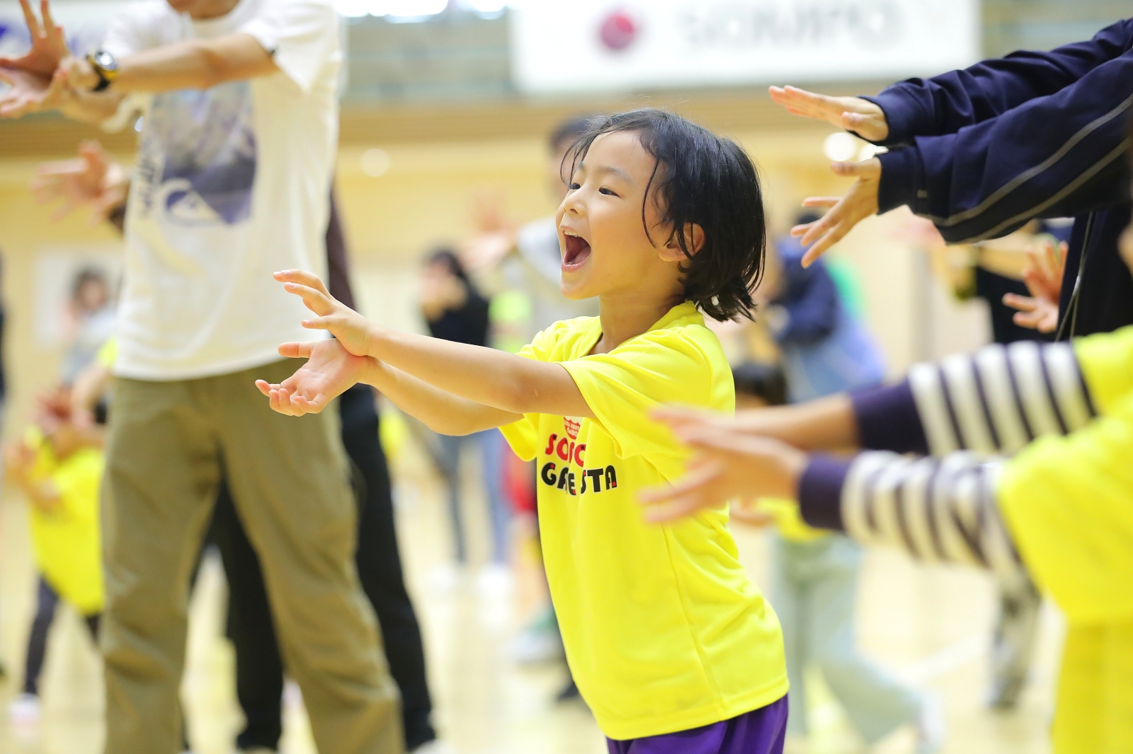 午前の開講式前は少し緊張した面持ちの子どもたちもプログラム開始早々、講師の「いわてぃ」と「いけちゃん」の"あそび"の虜に!