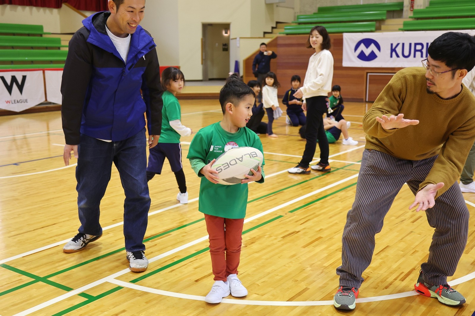 この日のキッズチャレンジはアンバサダー「きんちゃん」のラグビーを含む3競技での開催となりました!