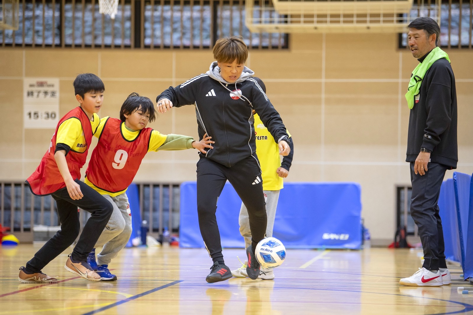 「やーちゃん」こと宮間あやさんと一緒にチャレンジしたフットサルでは、講師とやーちゃんの華麗なパス回しに振り回されながらも、最後はみんなでパスをつないでゴール!