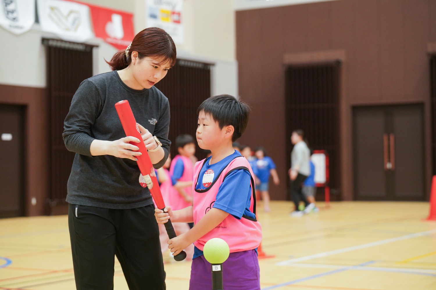 ソフトボールでは、上手にボールを投げたり打ったりできると、講師や同じチームのお友だちと元気よくハイタッチ!
