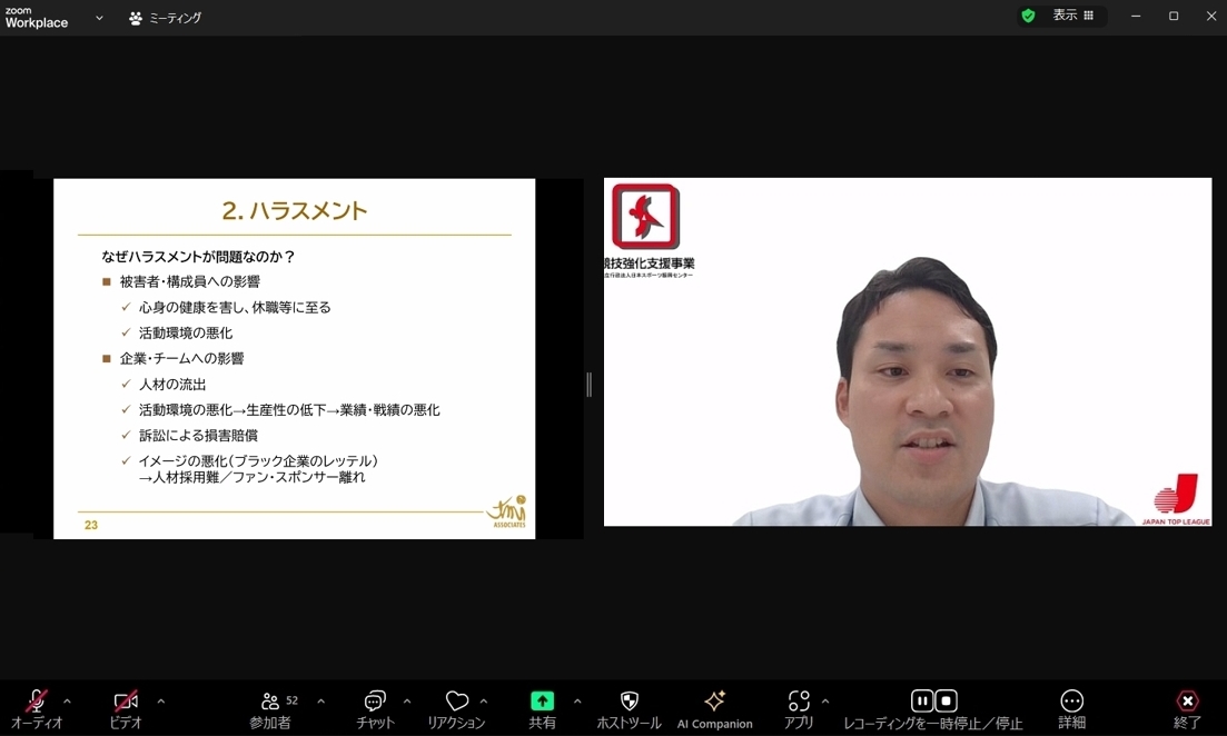 チーム・アスリートが国民・社会・ステークホルダーからの信頼を得て運営、活動する前提として、スポーツ界に求められている「コンプライアンス」の実践について、過去事例を踏まえて学びました。