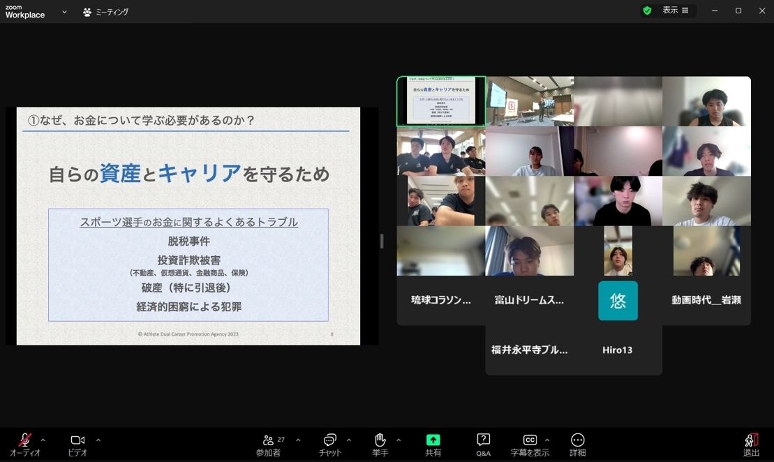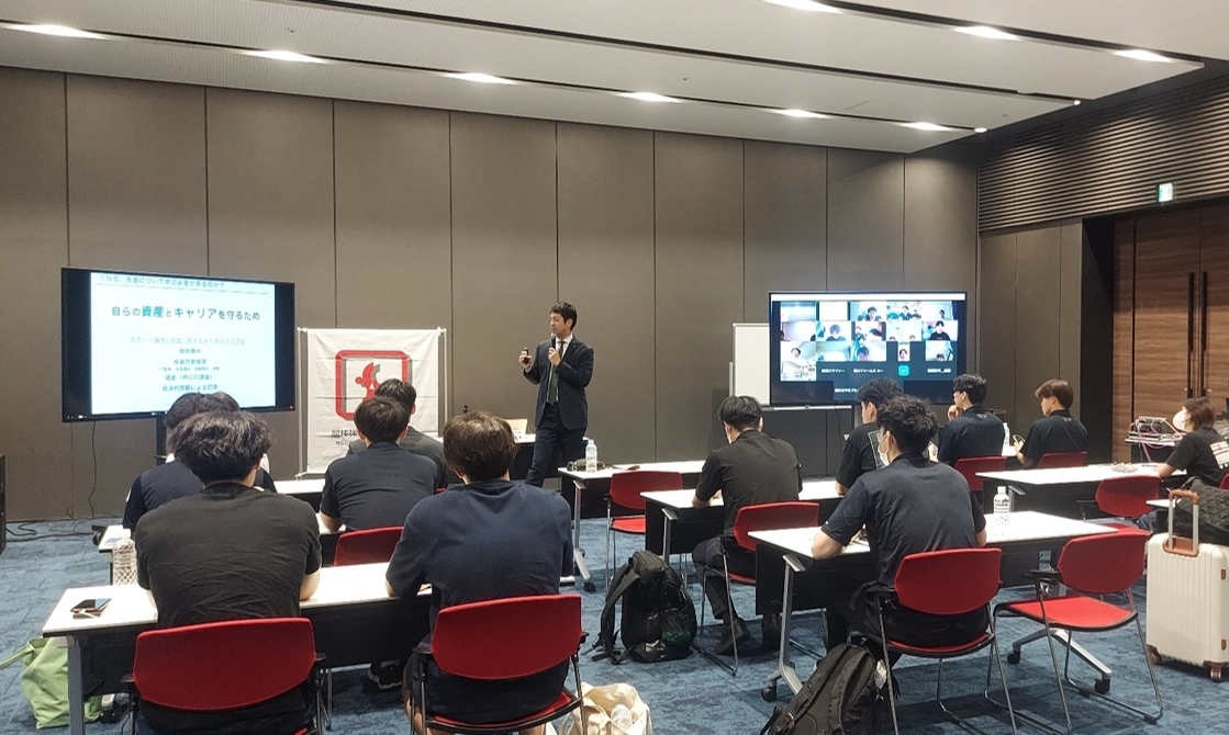 団体と選手個人の2つの視点から収入と支出を認識し、契約形態によるお金の違い、スポーツビジネスに係わるお金の話、税金や社会保険、引退後に繋がる資産形成など、アスリートが知っておくべき基本的なお金についての知識を学びました。