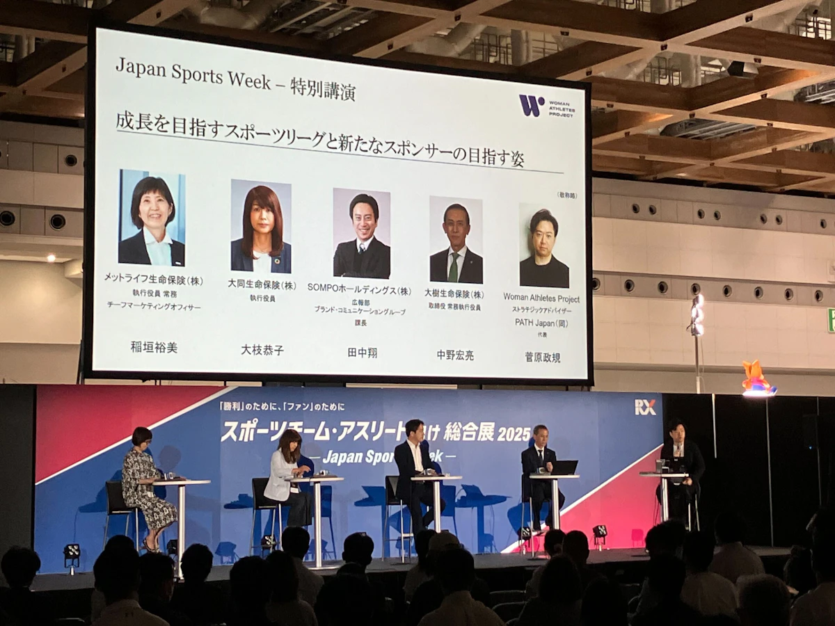 2025年6月25日(水)東京ビッグサイトにて行われた「Japan Sports Week 2025」にて、”成長を目指すスポーツリーグと新たなスポンサーの目指す姿”と題して特別講演を実施いたしました。今回は講師として、近年スポーツリーグのタイトルパートナーとして就任された企業から、メットライフ生命保険株式会社の稲垣裕美様、大同生命保険株式会社の大枝恭子様、SOMPOホールディングス株式会社の田中翔様、大樹生命保険株式会社の中野宏亮様、ファシリテーターとして菅原政規様をお招きし、リーグとスポンサーの関わり方についてパネルディスカッションを行いました。