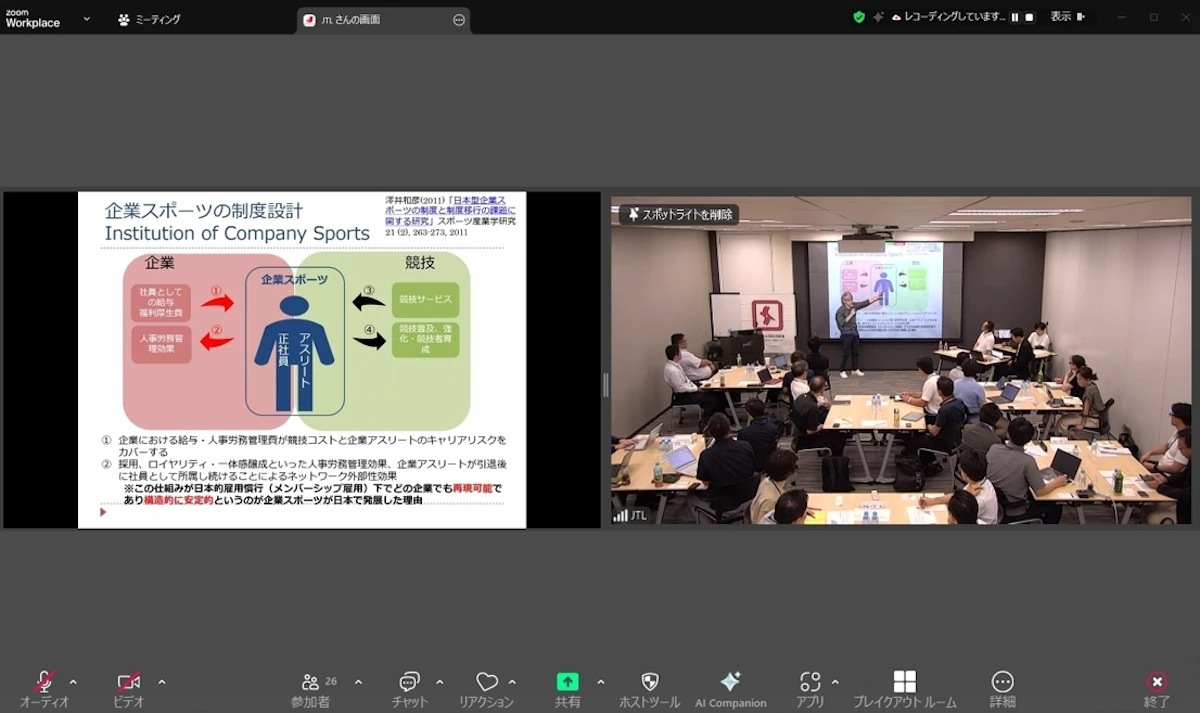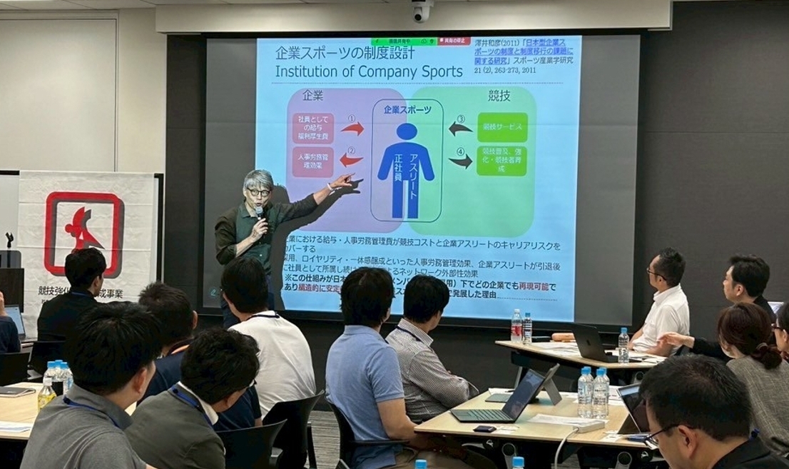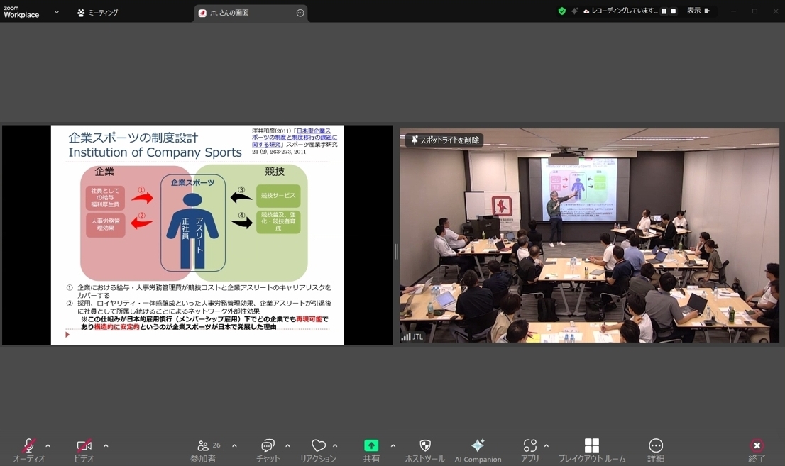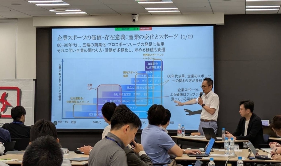 その後、ゲスト講師をお迎えしての講義と参加者によるグループワークを実施いたしました。前半の講義では、澤井 和彦 氏に登壇いただきました。「企業スポーツの成り立ち」をテーマに、企業スポーツの形成や価値構造、その変容と多様化について、具体例を交えたお話をいただきました。