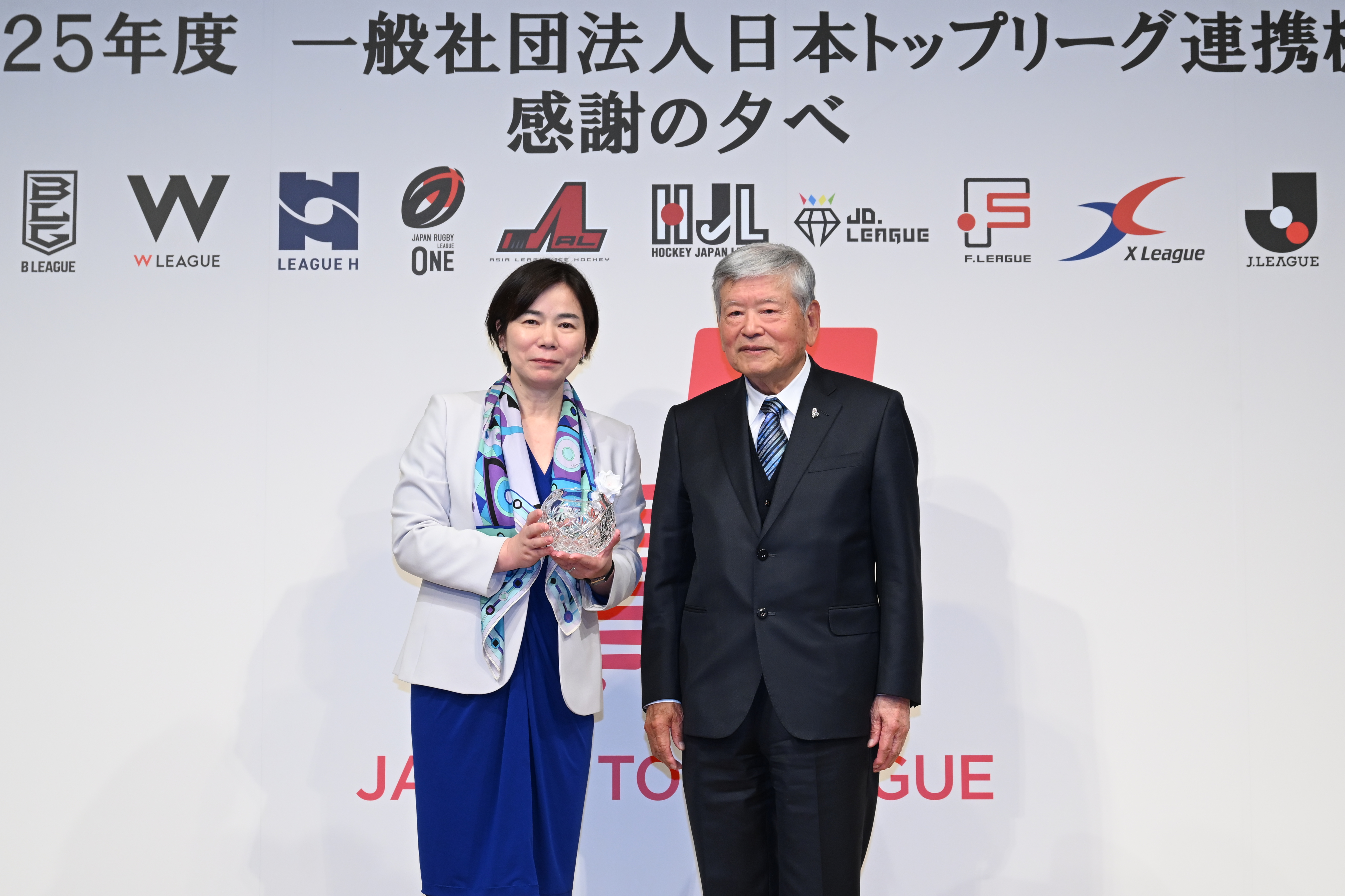 本年、2024-2025シーズンは、トップリーグトロフィー11名、特別功労賞2名が受賞いたしました。トップリーグトロフィーとは、当機構加盟の9競技12リーグにおいて、運営・マネジメントに貢献したGM(ゼネラルマネジャー)等に対し、また特別功労賞は当機構の運営等に特に顕著な功績のあった者に対し、それぞれその栄誉を讃えることを目的として授与しているものです。