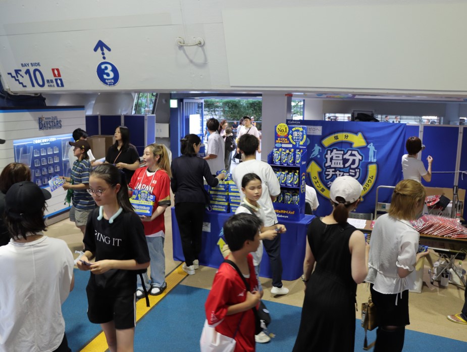 対象試合の会場にて、ブース出展と「塩分チャージタブレッツ」・リーフレットの配布等の活動を行い、夏の体調管理において、水分だけでなく塩分補給が重要であることの呼びかけを行いました。